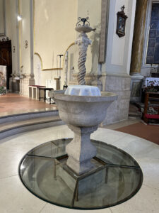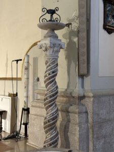 • colonna tortile per il cero pasquale, decorata con mosaici policromi e stemma dei Gabrielli, probabilmente legata a maestranze locali e a un ambiente artigianale vicino alle esperienze decorative della Strammetta