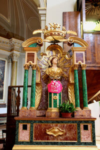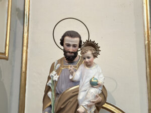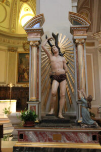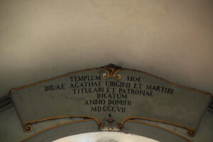 Altro fulcro devozionale è il busto reliquiario di Sant’Agata, preziosa scultura lignea policromata di ambito italiano, realizzata tra la fine del XVII e l’inizio del XVIII secolo. La santa è raffigurata in atteggiamento estatico, con lo sguardo rivolto verso l’alto: una scelta iconografica che comunica devozione assoluta e serena accettazione del martirio.