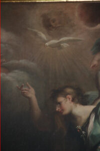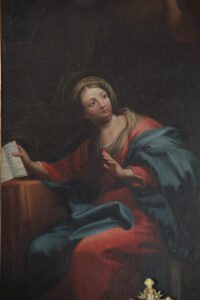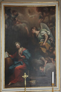 Tra le tele più notevoli figura l’Annunciazione (olio su tela cm 220 × 175), attribuita alla scuola di Carlo Maratta (XVII secolo). La compostezza delle figure, la dolcezza dei volti e la luminosità della scena rimandano al linguaggio marattesco. Secondo gli studi, solo un accurato restauro potrà chiarire definitivamente la paternità, oggi in parte compromessa da ridipinture e vernici ossidate. La tela resta comunque un documento di grande equilibrio spirituale ed eleganza classica.
