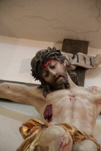 Di forte impatto devozionale è il Crocifisso ligneo a grandezza naturale (XIX secolo), donato dal Principe Gabrielli, con ai piedi la statua della Madonna Addolorata. La resa anatomica e la policromia enfatizzano il realismo e invitano alla meditazione sul mistero della Croce.