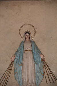 Collocata sopra l’altare laterale sinistro, la statua dell’Immacolata Concezione (XIX secolo) mostra Maria con braccia aperte e raggi dorati che si dipartono dalle mani, simbolo delle grazie celesti. Il piedistallo e la nicchia, con modanature dorate, dialogano con lo stile neoclassico dell’edificio.