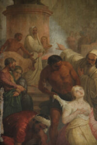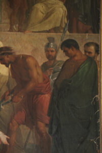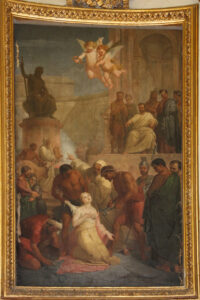 Sul fondo compare il proconsole Quinziano, mentre in alto angioletti sorreggono palma e corona, simboli di martirio e gloria. La presenza di Giove, in alto a sinistra, rimarca la contrapposizione tra potere pagano e fede cristiana: un tema caro alla pittura accademica del secolo.