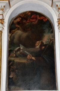Il dipinto di San Girolamo (XVIII secolo) unisce iconografia penitenziale e meditazione sulla vanitas: libro, clessidra e teschio accompagnano la preghiera del santo davanti al Crocifisso, mentre gli angeli tra le nubi collegano la scena terrena alla dimensione celeste.