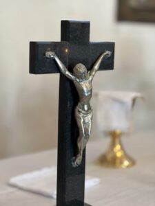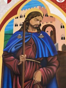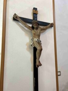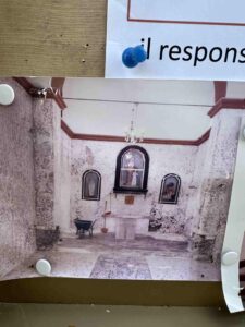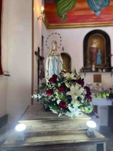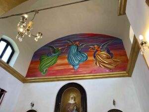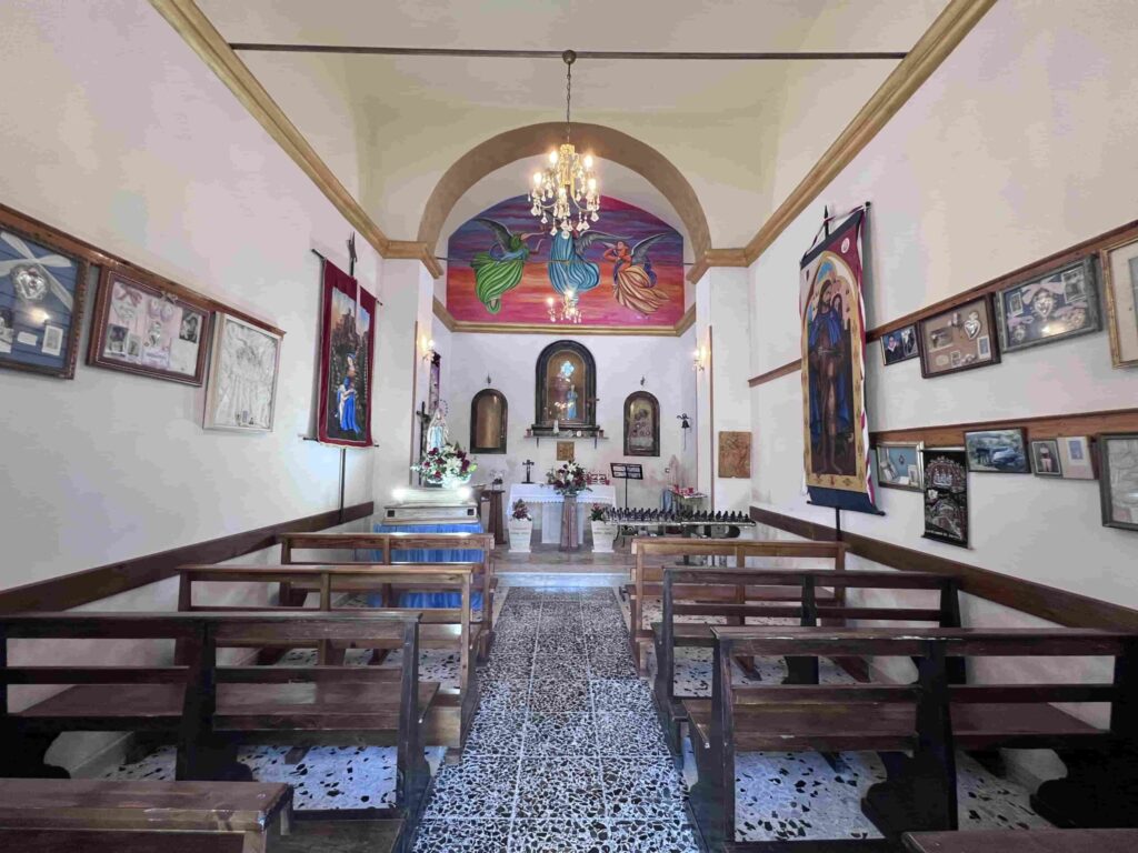 All’interno della chiesa si respira un’atmosfera intima e solenne. Gli arredi semplici e i banchi in legno accolgono i fedeli davanti a un altare arricchito da fiori e ex voto. Particolarmente suggestivo è l’affresco della volta dell’abside, una scena luminosa e intensa che raffigura angeli in volo, realizzata con grande maestria dall’artista Rocco Lancia.
