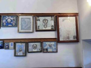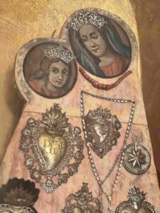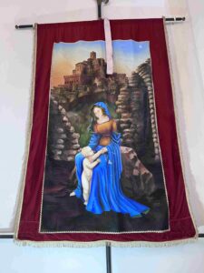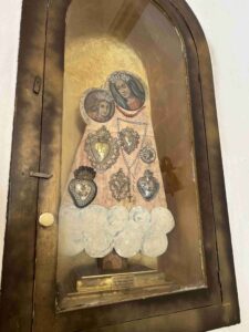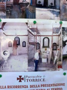 Sulle pareti laterali, immagini sacre, fotografie, ricami votivi e drappi custodiscono la memoria di generazioni di fedeli. A impreziosire ulteriormente l’ambiente ci sono i gonfaloni realizzati da Sabrina Trasolini, in concomitanza dei festeggiamenti del Palio delle Contrade, opere artigianali che esprimono con eleganza e profondità la devozione del popolo torriciano.