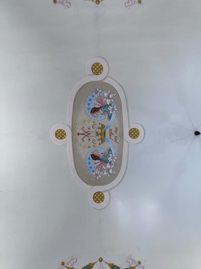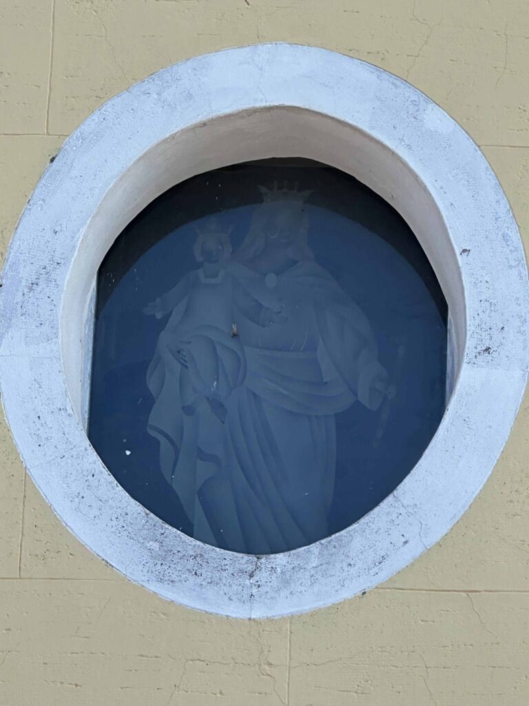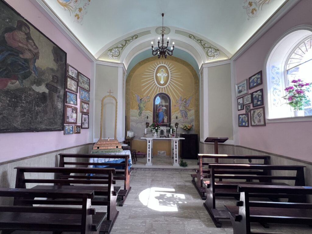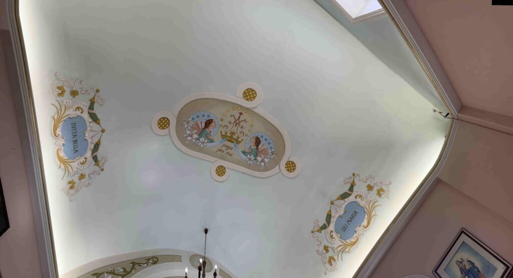 L’interno è raccolto, intimo, e curato nei minimi dettagli. L’altare, decorato con affreschi luminosi e angelici, ospita la statua della Madonna dell’Aiuto con il Bambino, entrambi incoronati, simbolo di protezione e speranza. La luce naturale che entra dalle finestre rende l’ambiente ancora più accogliente.