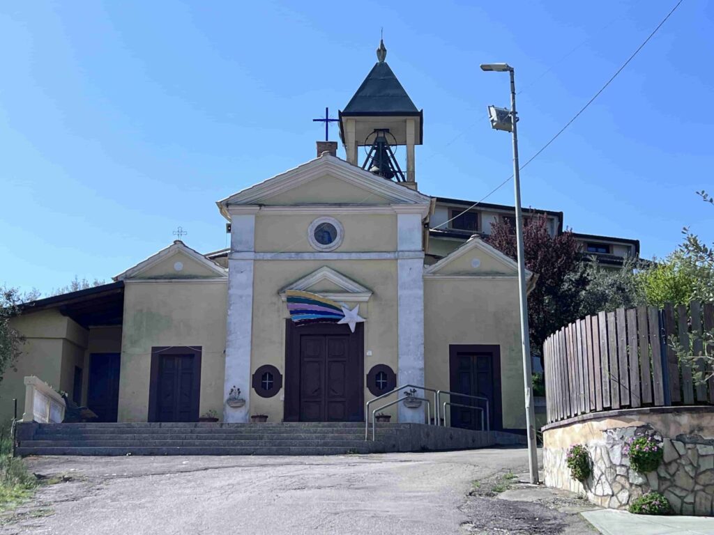 La chiesa si presenta con una struttura sobria e armoniosa, arricchita da un piccolo campanile e da elementi simbolici come la stella con i colori della pace, che ne decora l’ingresso. All’interno, l’atmosfera è raccolta e luminosa, con una navata centrale che guida lo sguardo verso l’altare e le decorazioni del soffitto.