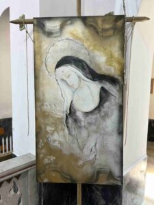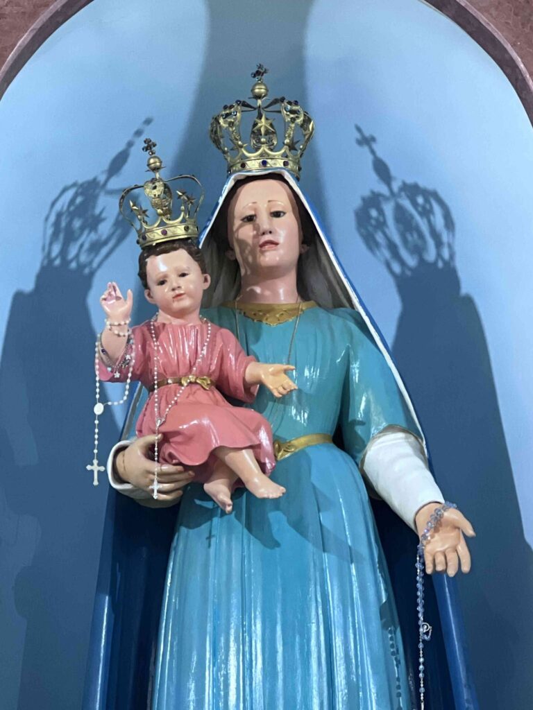 - La statua della Madonna delle Grazie, con il Bambino Gesù tra le braccia e la scritta “Mater Divinæ Gratiæ”, è posta al centro dell’altare maggiore.
