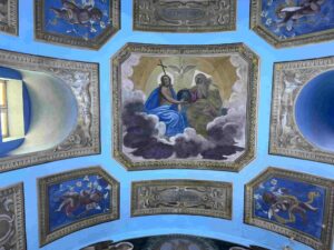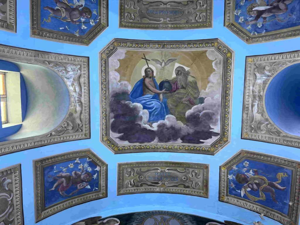 - Il cielo affrescato con la rappresentazione della Santissima Trinità e angeli circonda i fedeli in un abbraccio di arte e spiritualità.