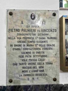 All’interno della chiesa è posta una lapide commemorativa dedicata a Pietro Palmieri, fondatore del tempio, che morì nel 1943. Il testo ricorda con affetto e gratitudine la sua opera e il suo esempio di onestà, pietà e dedizione alla comunità.