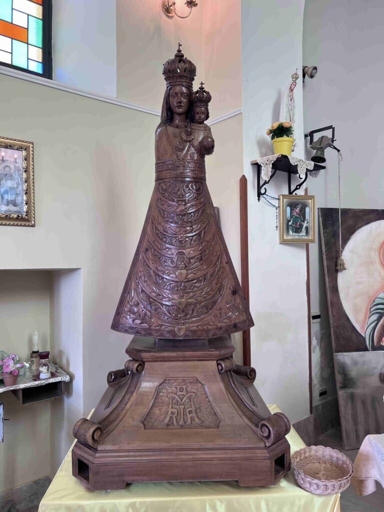 Il cuore della chiesa è la grande statua lignea della Madonna di Loreto, opera finemente intagliata che ritrae la Vergine con il Bambino in braccio, entrambi incoronati. La Madonna indossa un abito solenne e decorato, secondo la tradizione iconografica della Madonna Lauretana, la cui devozione è profondamente radicata nella cultura popolare italiana.