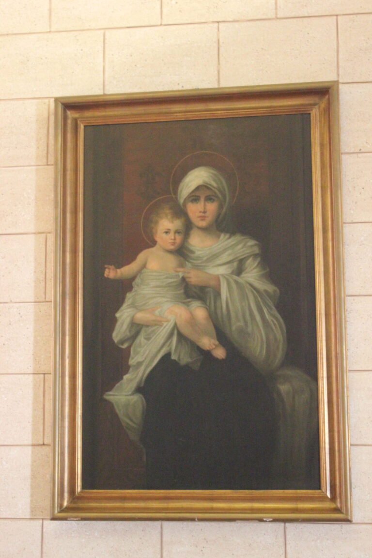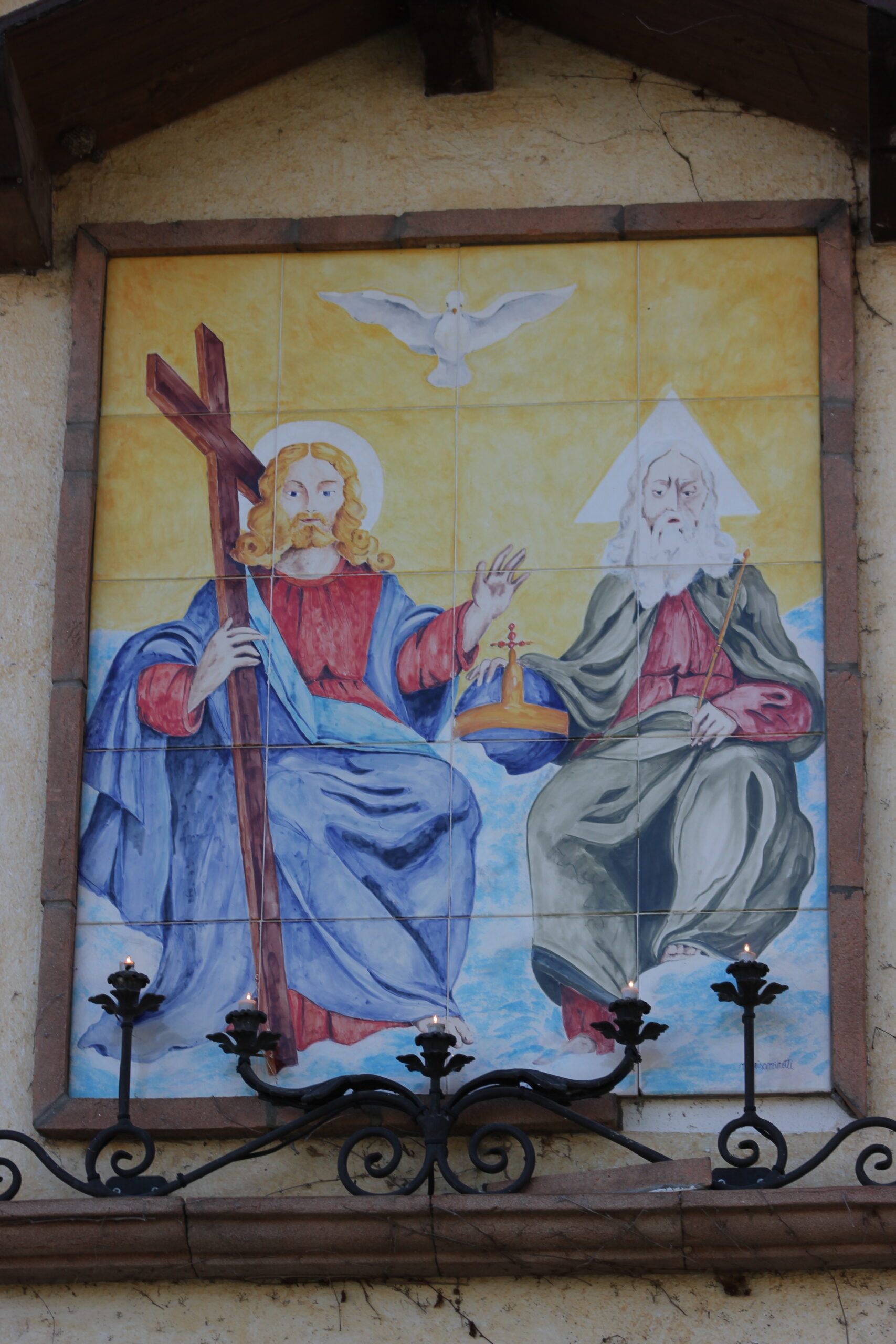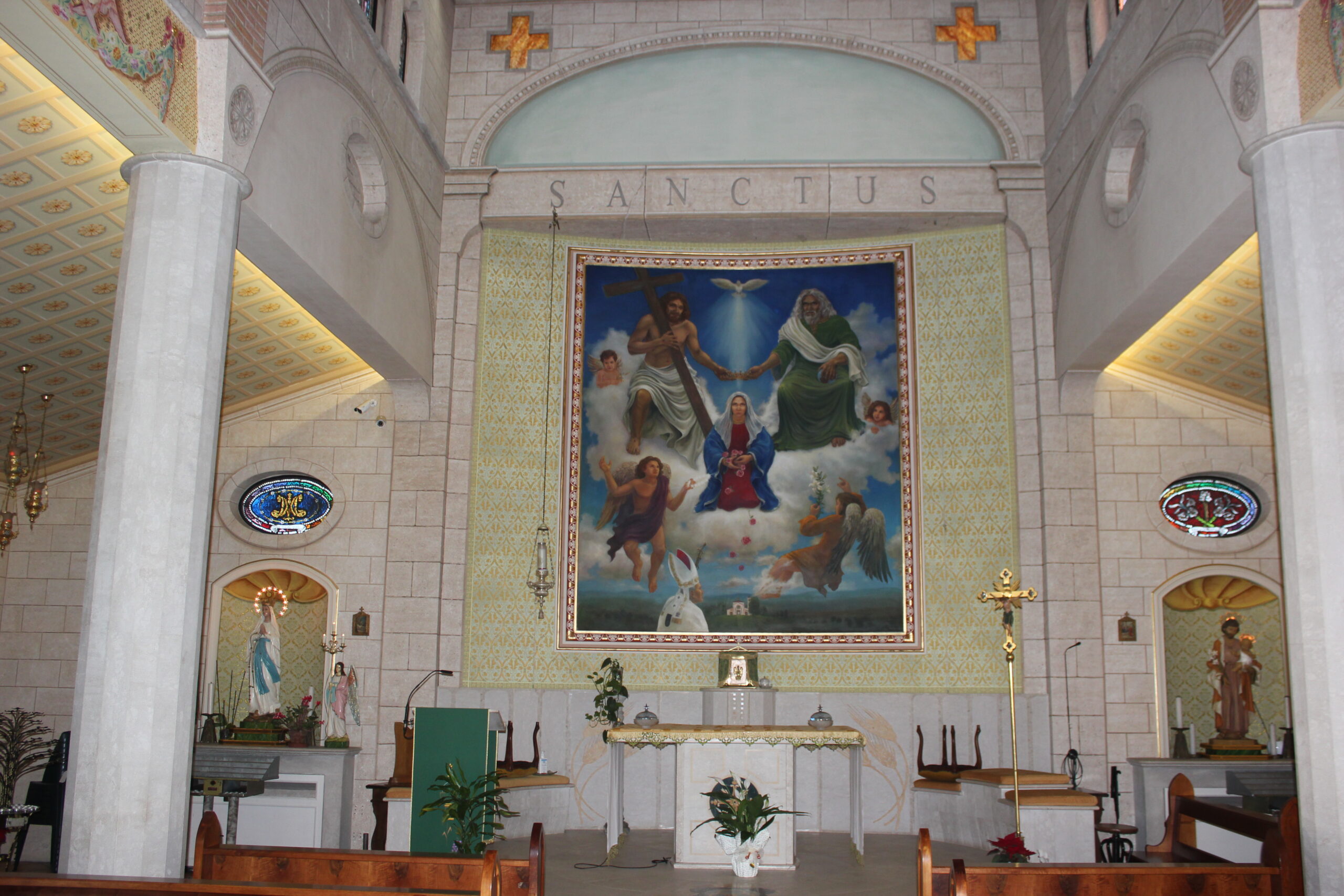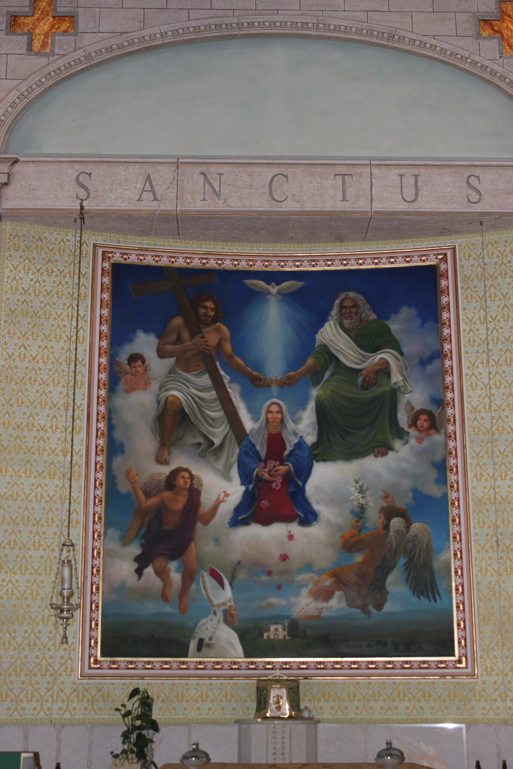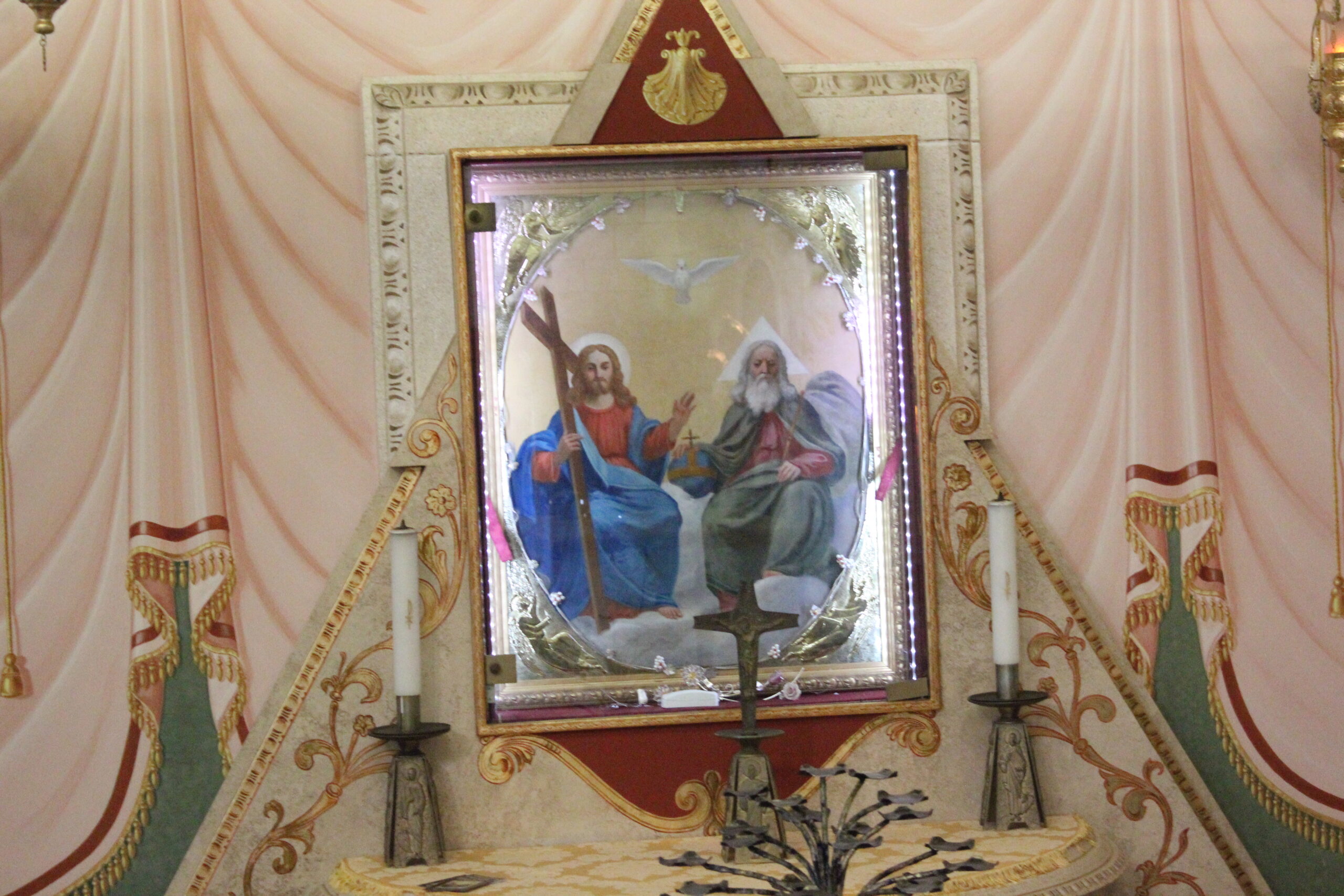 Era presente una semplice tela a carattere devozionale donata dalla comunità americana. Il quadro della Santissima Trinità fu acquistato a Roma ed è un olio su tela. L’iscrizione riporta queste indicazioni: “Dono della colonia americana. Anno 1922”. Fu quindi impreziosito da una copertura di argento dorato dei maestri scultori orafi di Arezzo. (etichetta su quadro santissima)