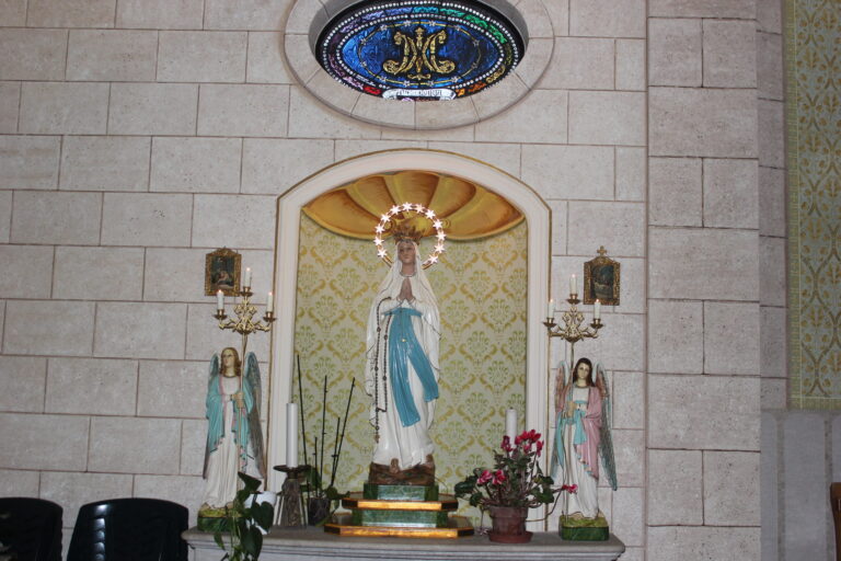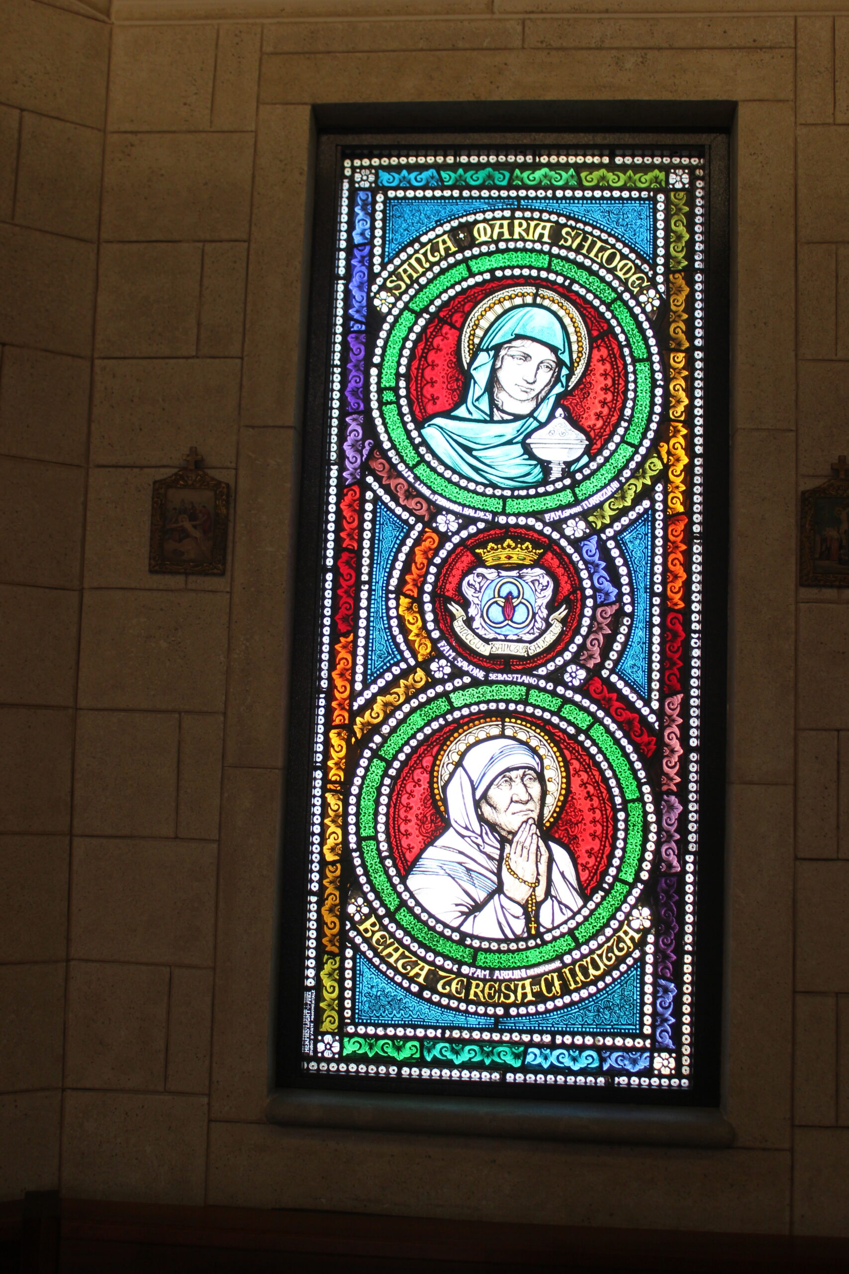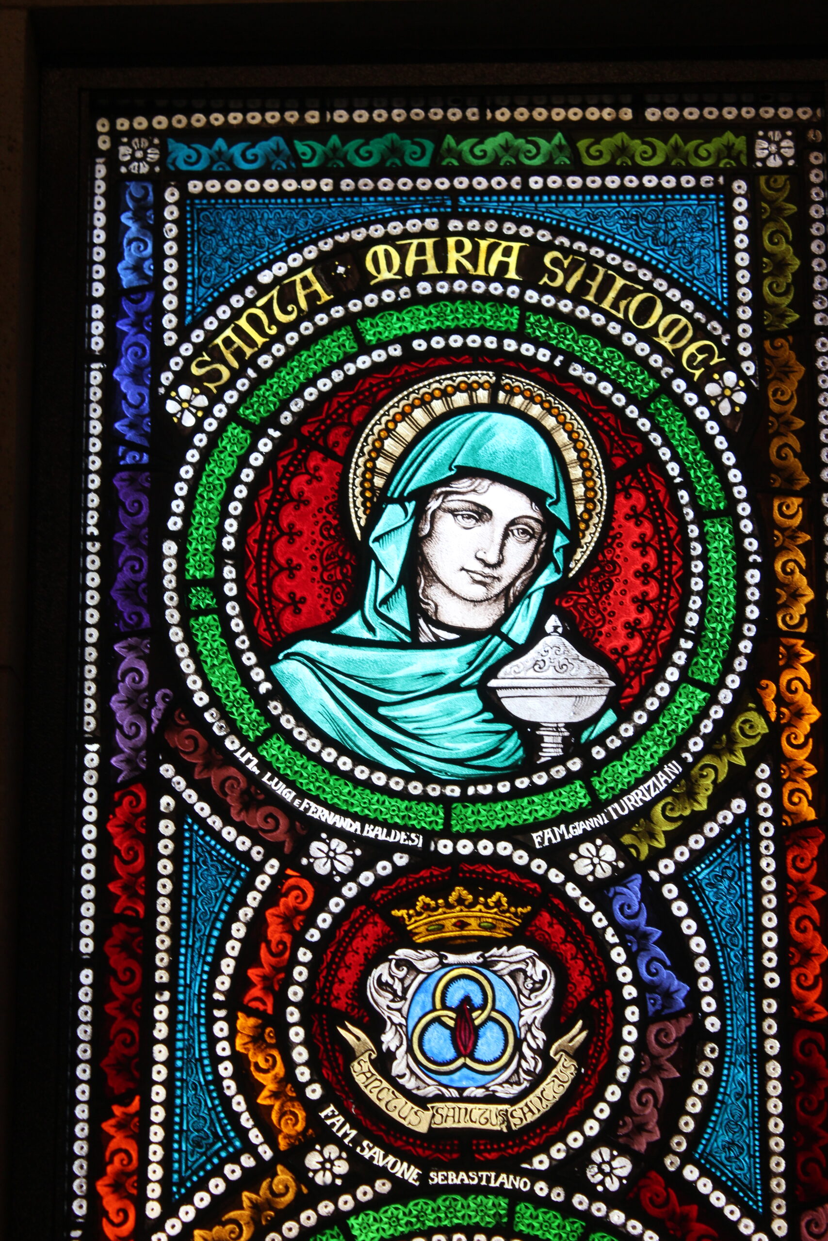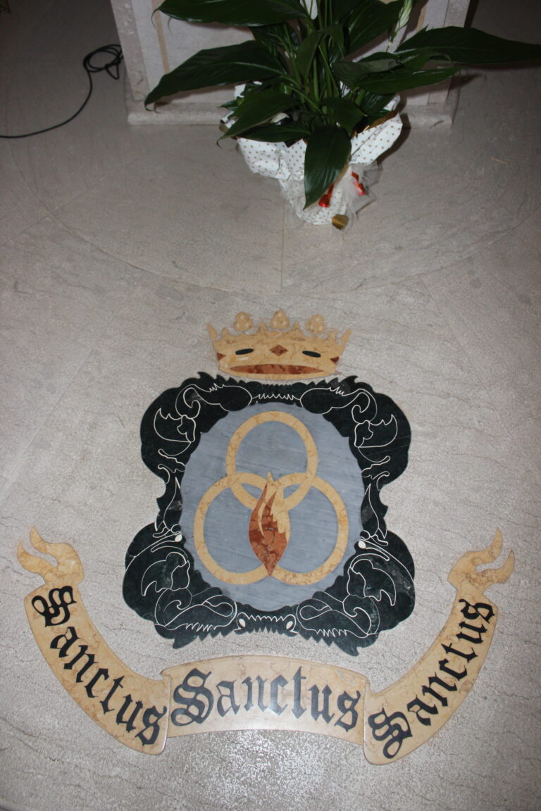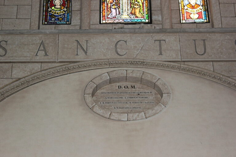 Nell’altare si conservano le reliquie di santi anche originari del territorio. Lo ricorda un’altra iscrizione incisa anche questa in un ovale in pietra che si trova invece a sinistra della cupola sopra l’altare. Si legge: “Sono deposte in questo altare le reliquie di Santa Maria Salome, Sant’Ambrogio Martire, Beata Maria Fortunata Viti, Beata Teresa di Calcutta, B.M. Raffaella Cimatti”. La Viti è stata una religiosa benedettina di Veroli vissuta tra l’800 e il 900. Così come le spoglie di Santa Maria Salome sono custodite nell’omonima Basilica verolana perché trovate in quel territorio. Tra l’altro nella medesima basilica è collocata la terza scala al mondo dove si può ricevere l’indulgenza plenaria. La Beata Maria Raffaella Cimatti, farmacista, si impegnò perché medici e infermieri non venissero meno al loro dovere di assistenza ai degenti dell’ospedale di Alatri, unico rimasto in funzione nelle immediate retrovie del fronte durante la seconda guerra mondiale. (etichetta su iscrizione)