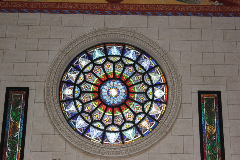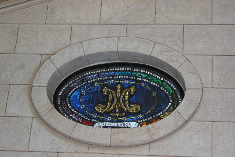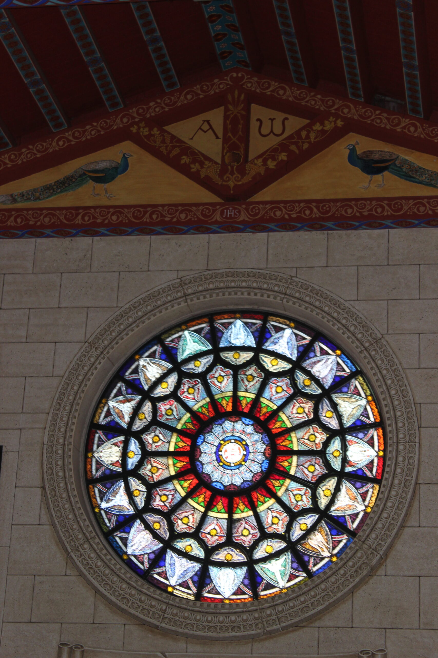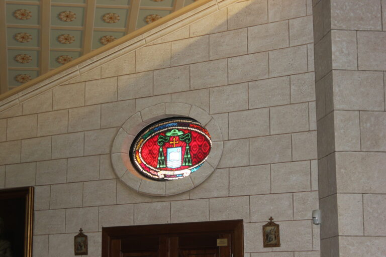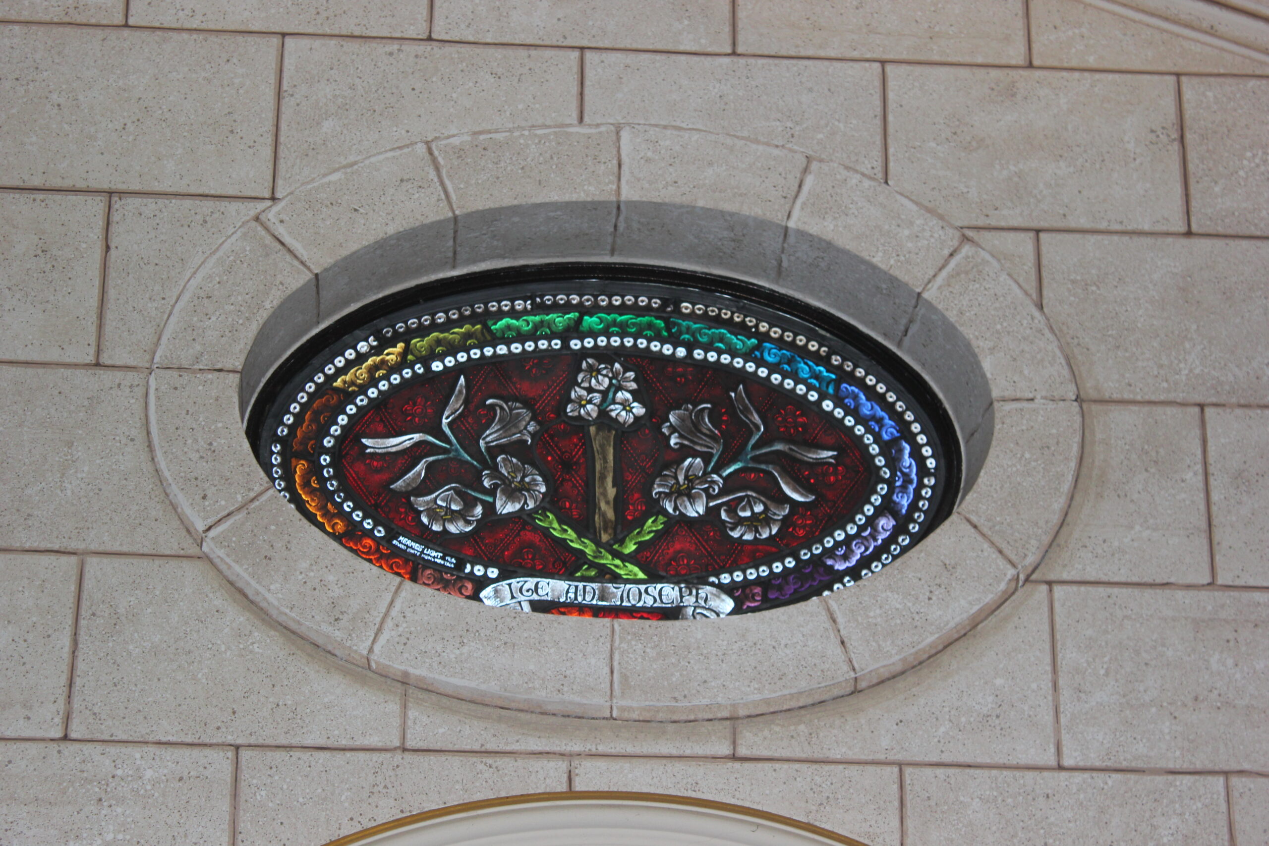 Le vetrate rappresentano i dodici apostoli e i santi patroni della Diocesi di Frosinone, Veroli e Ferentino ovvero Sant’Ambrogio e Santa Salome. Ritratti anche Madre Teresa di Calcutta e Padre Pio. Mentre il rosone, capolavoro unico, rappresenta la gloria dell’Agnello di Dio attorniato da angeli, arcangeli e cherubini. Le due grandi feritoie attorno al rosone, rappresentano i frutti della nostra terra quali olio e olivo.