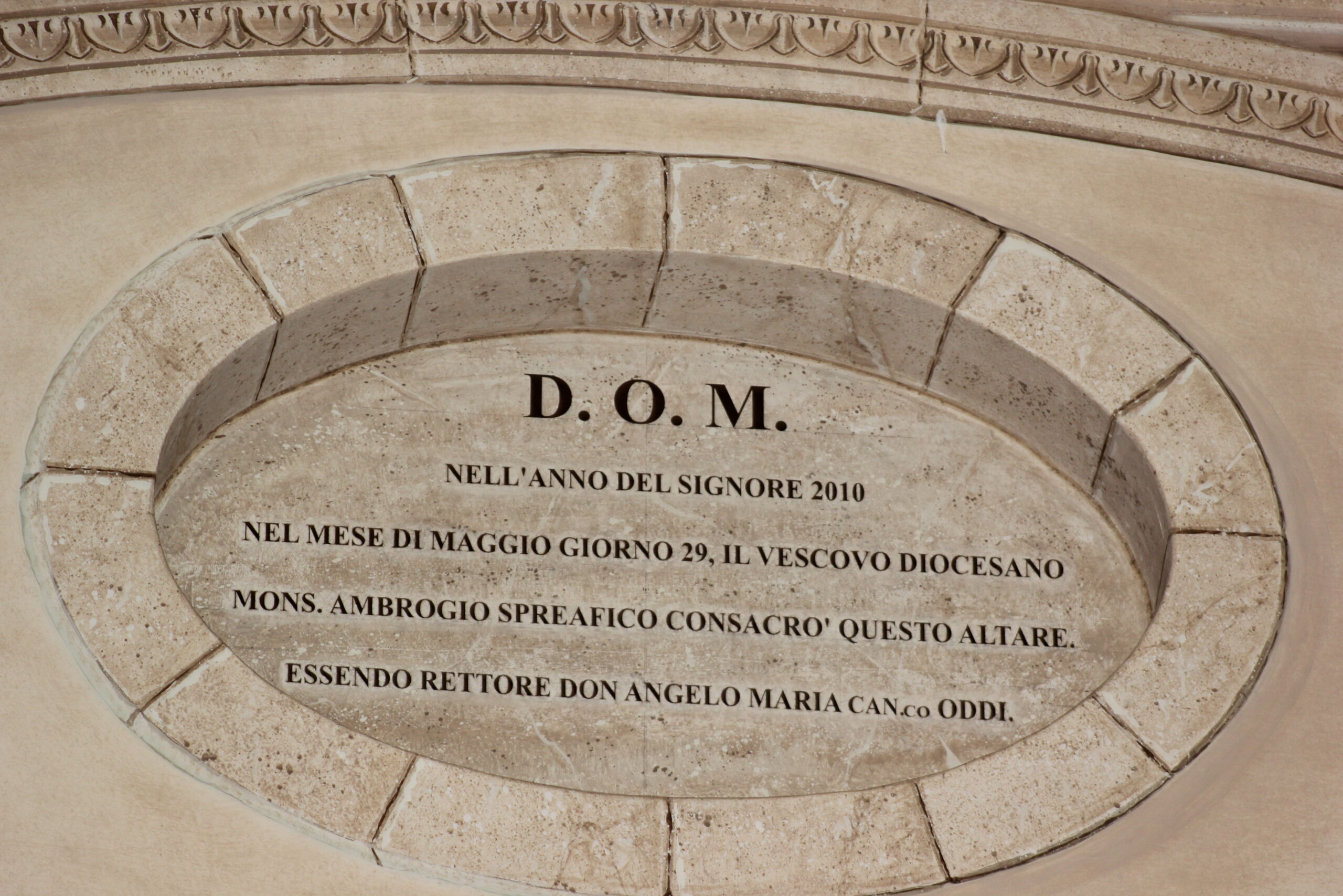L’evento di consacrazione dell’altare è ricordato in un’iscrizione ovale posta sul lato destro della cupola che sormonta l’altare: “Nell’anno del Signore 2010, nel mese di maggio giorno 29, il vescovo diocesano monsignor Ambrogio Spreafico consacrò questo altare ponendo rettore Don Angelo Maria canonico Oddi”.